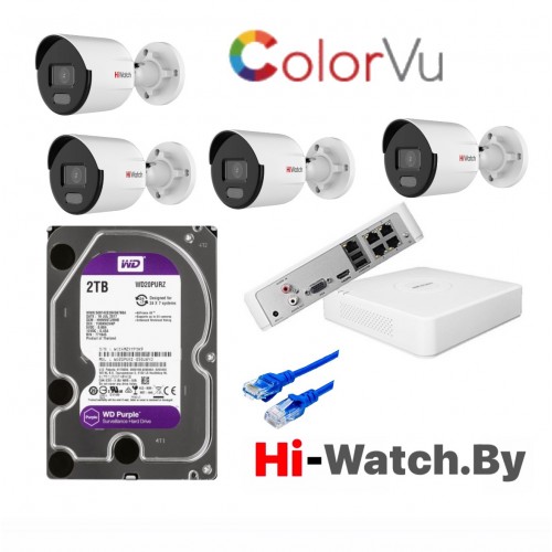 Комплект IP видеонаблюдения на 4 видеокамеры 2 МП HiWatch KIT-DS250L-4 P c технологией ColorVu. Запись цветного изображение круглосуточно!